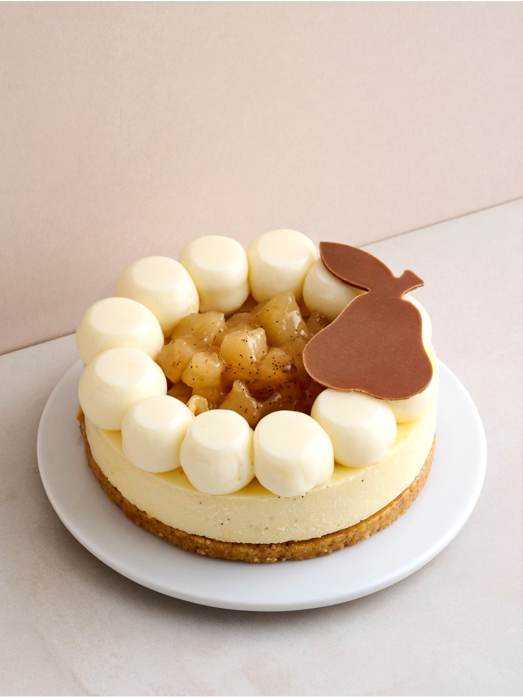 Cheesecake je doplněn namelakou s tonkou a hruškovým compoté, které vytvářejí harmonické spojení chutí.